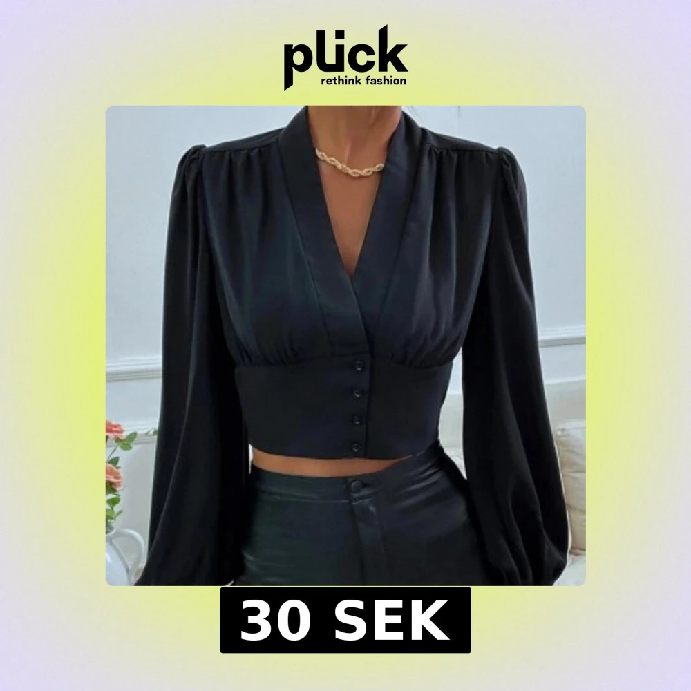 Snygg svart croppad blus med djup v-ringning och långa puffärmar. Blusen har bred midjedel med dekorativa knappar framtill.