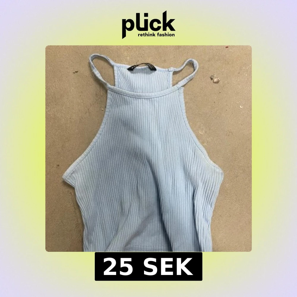 Säljer en ljusblå ribbad linnetopp från SHEIN med smala axelband och hög halsringning. Toppen är ärmlös och har en croppad passform, perfekt för varma dagar.