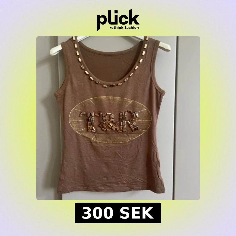 Cool brun linnetopp med glansig gulddekor och pärlor både runt halsringningen och på bröstet där det står 'ICB'. Perfekt för dig som gillar unika detaljer och vill sticka ut lite extra. Mjuk och skön bomullskänsla, ärmlös och med rund hals.