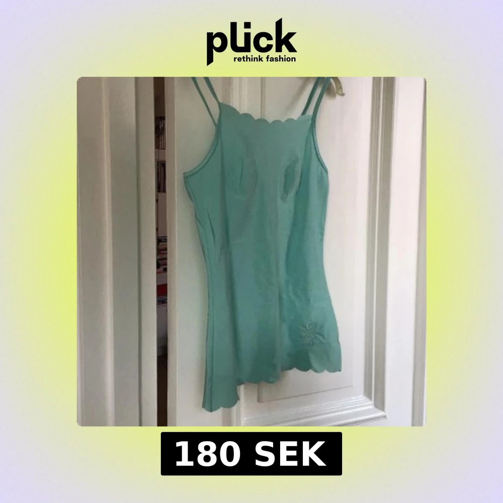 Säljer en söt mintgrön linne med smala axelband och en broderad fjärilsdetalj. Linne har en vågig kant upptill och nedtill, vilket ger en lekfull touch. Perfekt för varma dagar!