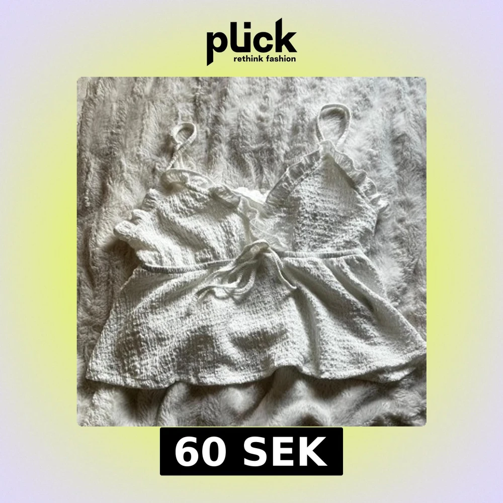 Söt vit topp med volangdetaljer och knytband framtill. Perfekt för varma sommardagar. Den har en smickrande v-ringning och är tillverkad i ett lätt och luftigt material. Aldrig använd🩷