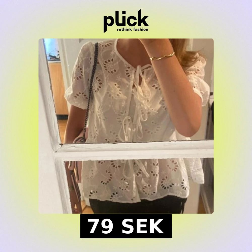 Superfin vit blus med korta puffärmar och broderade blommor. Blusen har två knyt framtill och är lätt transparent med snygga hålbroderier. Perfekt för dig som gillar romantisk och söt stil. Passar till både jeans och kjol.