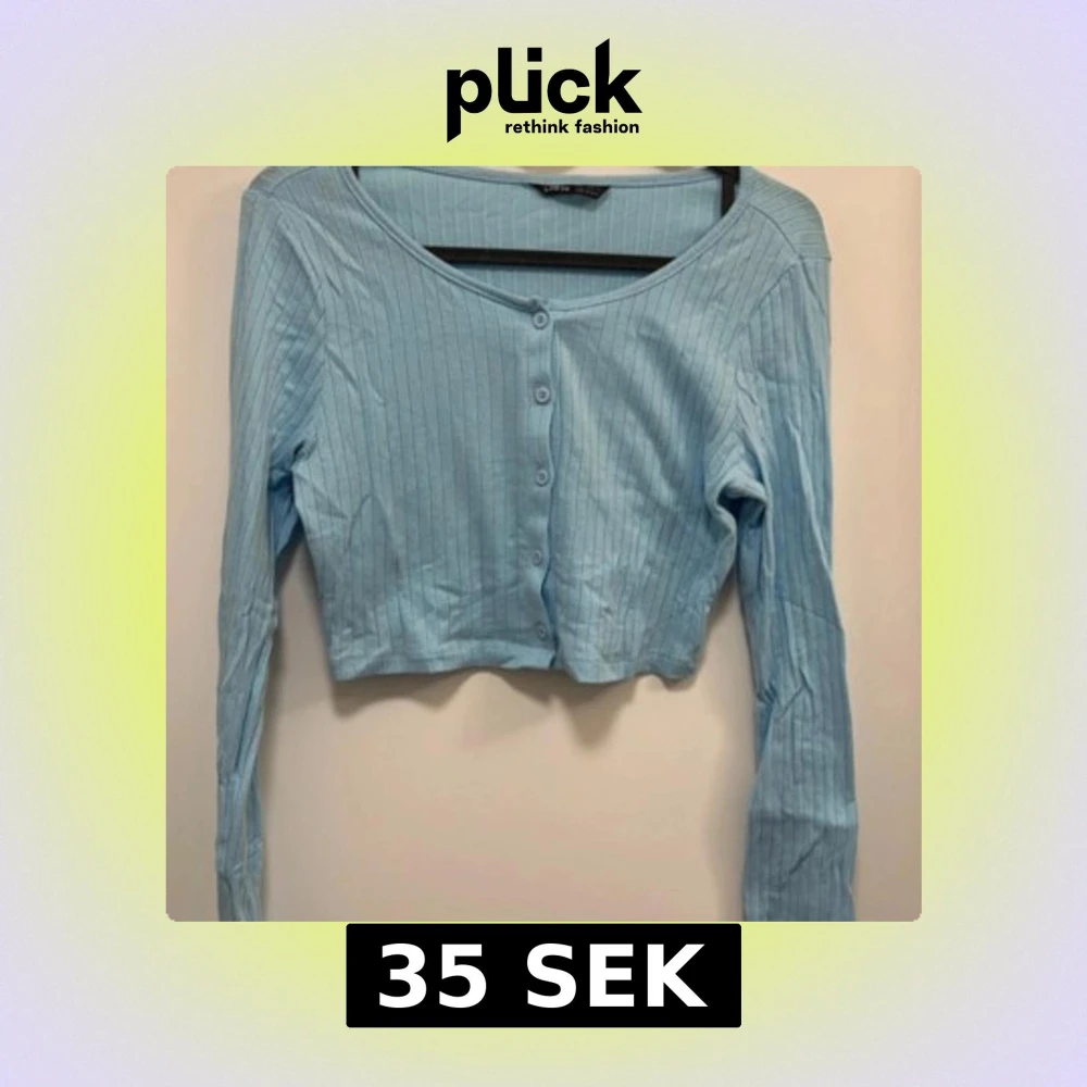 Säljer en ljusblå croppad topp med långa ärmar och knappar framtill. Toppen har ribbad struktur och en enkel, stilren design som passar perfekt till jeans eller kjol.