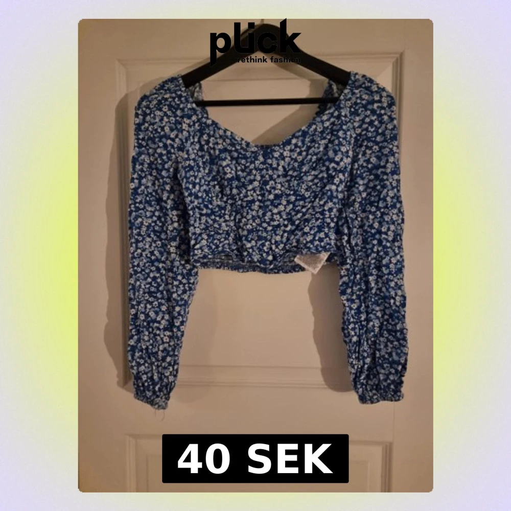 Säljer en blå croppad blus med vita blommor, långa puffärmar och knappar framtill. Toppen har smockad midja och är tillverkad i ett mjukt bomullsliknande material. Perfekt för dig som gillar romantiska och färgglada plagg med mycket detaljer.