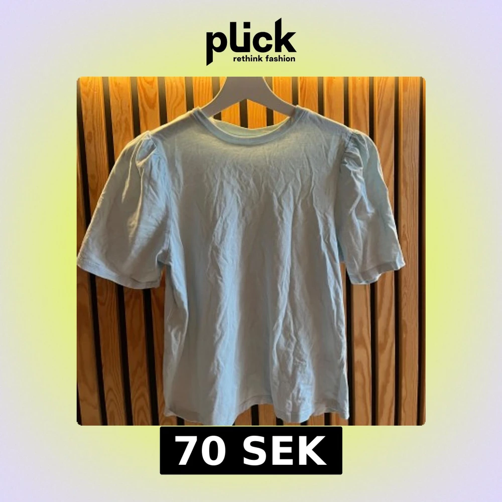 Ljusblå topp med puffärmar - Säljer en ljusblå topp med puffiga kortärmar och rund halsringning. Toppen är gjord i mjuk bomull och har en enkel, stilren design som känns både trendig och söt. Perfekt att matcha med jeans eller kjol för en fräsch look.
