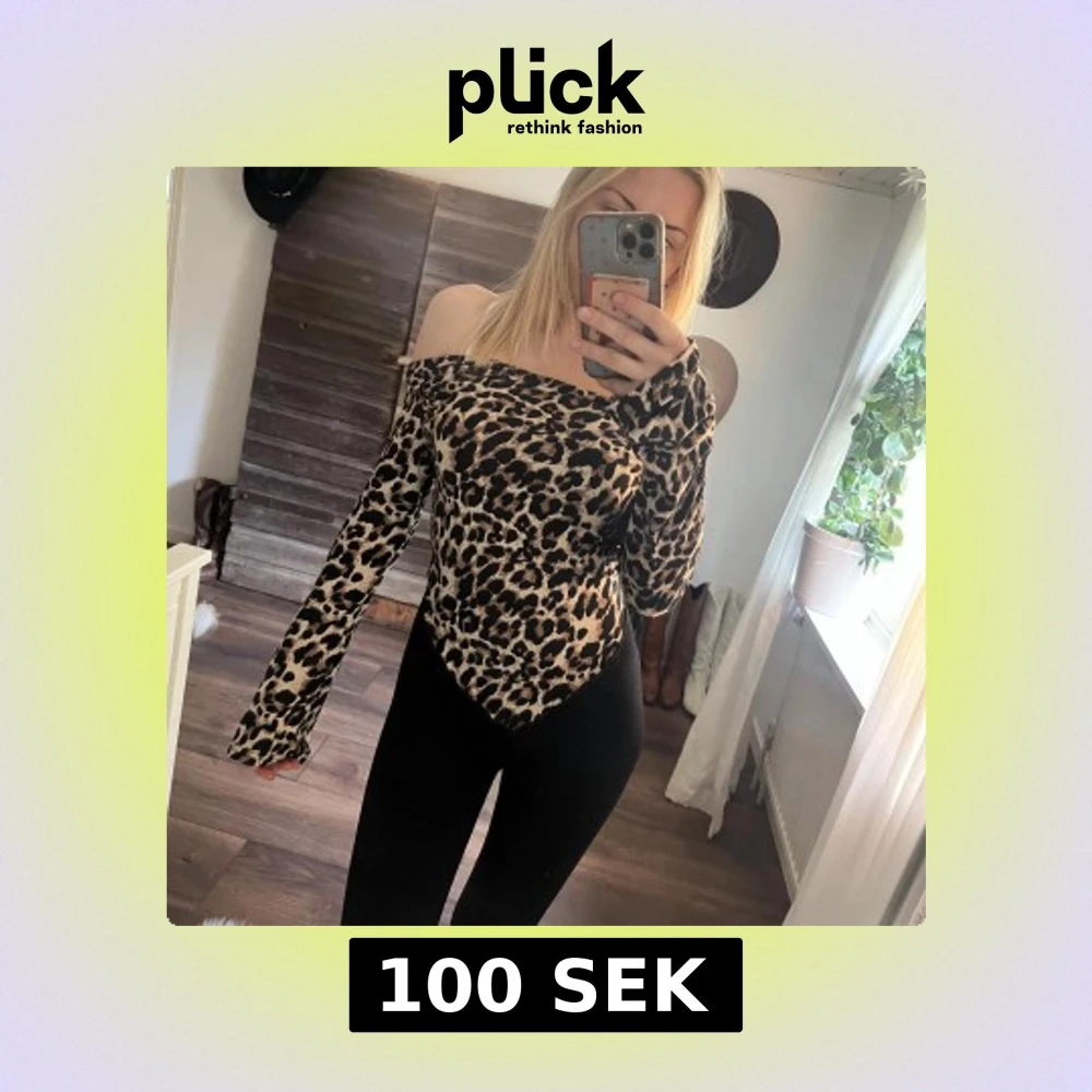 Säljer en snygg offshoulder topp med leopardmönster. Toppen har långa ärmar och är figurnära med en spetsig nederkant framtill. Färgerna går i beige, svart och brunt. Perfekt för dig som vill sticka ut med ett djurmönster.