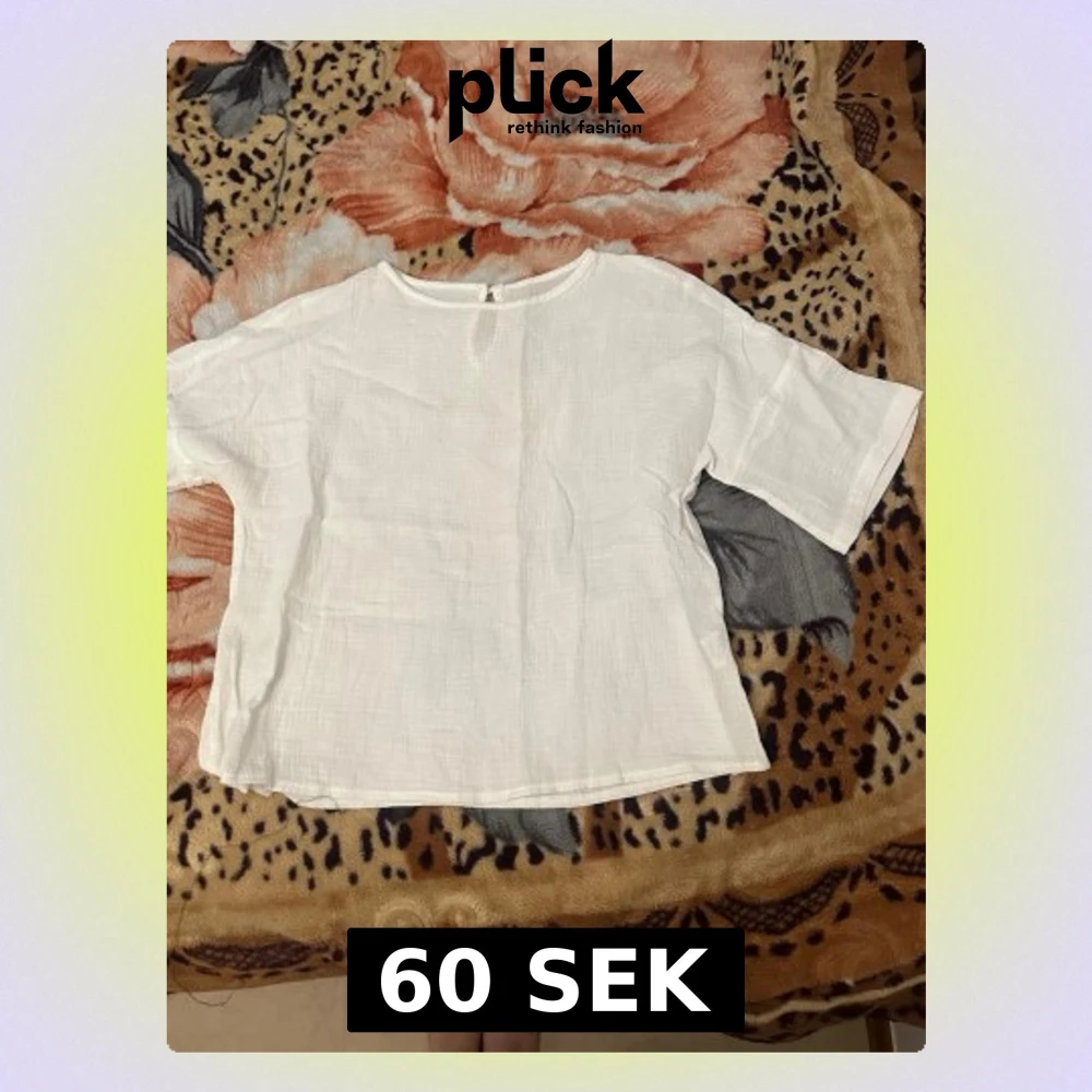En enkel och luftig vit blus i bomull med korta ärmar och rund halsringning. Blusen har en avslappnad passform och en liten knappdetalj i nacken. Perfekt för varma dagar och enkel att styla till olika outfits. Använd 2-3 gånger men ändå perfekt för en varm sommardag.