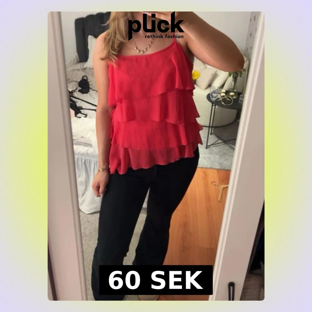 Snygg röd linnetopp med flera lager volanger och tunna axelband. Perfekt för dig som vill sticka ut lite extra. Luftig och lätt, passar bra till både jeans och kjol.