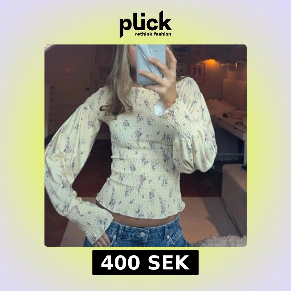 Säljer en söt blommig ribbad topp i ljusgul färg. Toppen har långa ärmar och en tight passform med volangdetaljer vid ärmslut och nederkant. Perfekt för en romantisk look!