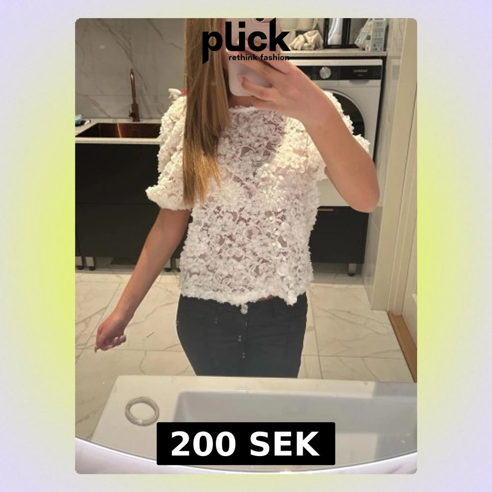 Supersöt vit blus med blommigt mönster och volangdetaljer. Blusen är något transparent och har korta ärmar samt en sopass loose passform. Perfekt för dig som vill sticka ut med en unik topp till jeans eller kjol.