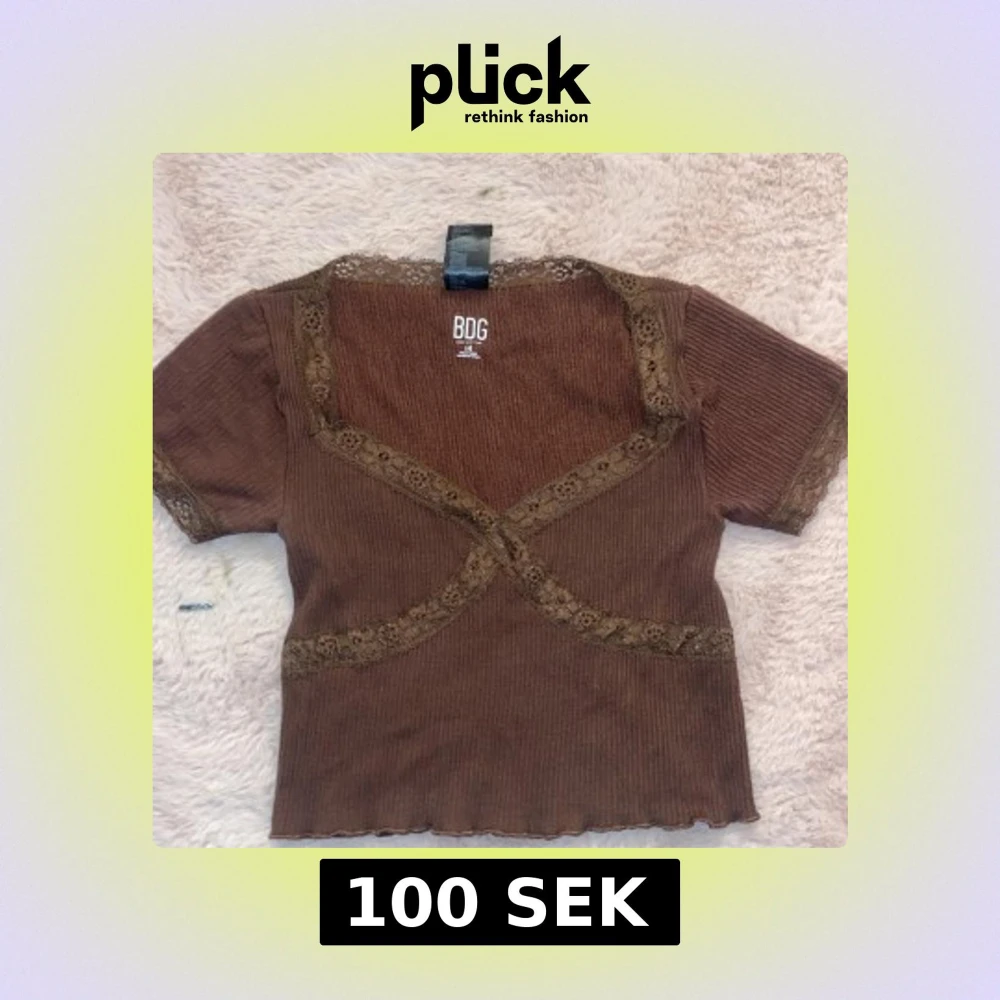 Säljer en brun ribbad topp från BDG med spetsdetaljer längs halsringningen och ärmsluten. Toppen har en omlott-design framtill och korta ärmar. Perfekt för en stilren look!