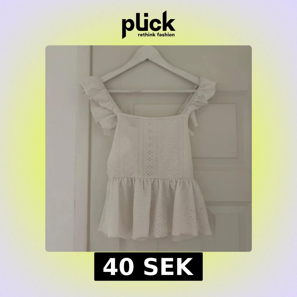 Supersöt vit blus med volangdetaljer på axelbanden och broderade hålmönster. Blusen har en luftig, peplum-liknande nederdel och knytning i ryggen för extra charm. Perfekt för dig som gillar romantisk och feminin stil.