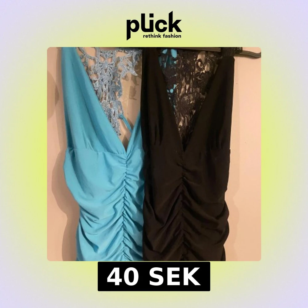 Säljer två snygga fest toppar, en i svart och en i ljusblå. Båda har djup v-ringning, rynkade detaljer framtill och en unik spetsrygg som ger en cool touch. topparna ärmlösa och har figurnära passform.