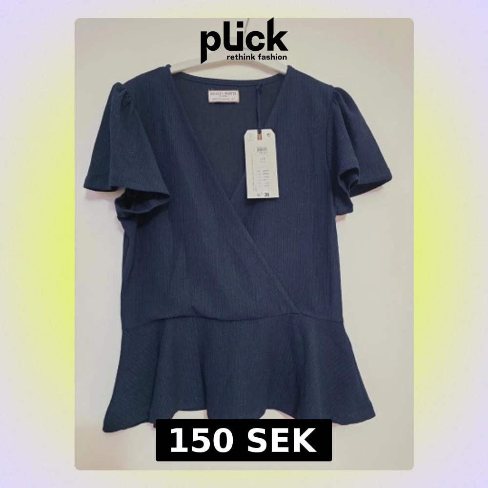 Mörkblå omlottopp från Holly & Whyte - Supersnygg mörkblå omlottopp från Holly & Whyte med korta puffärmar och volang nertill. Toppens struktur är lätt ribbad och den har en v-ringad hals. Perfekt för dig som gillar en feminin och trendig look. Helt ny med prislapp och oanvänd.