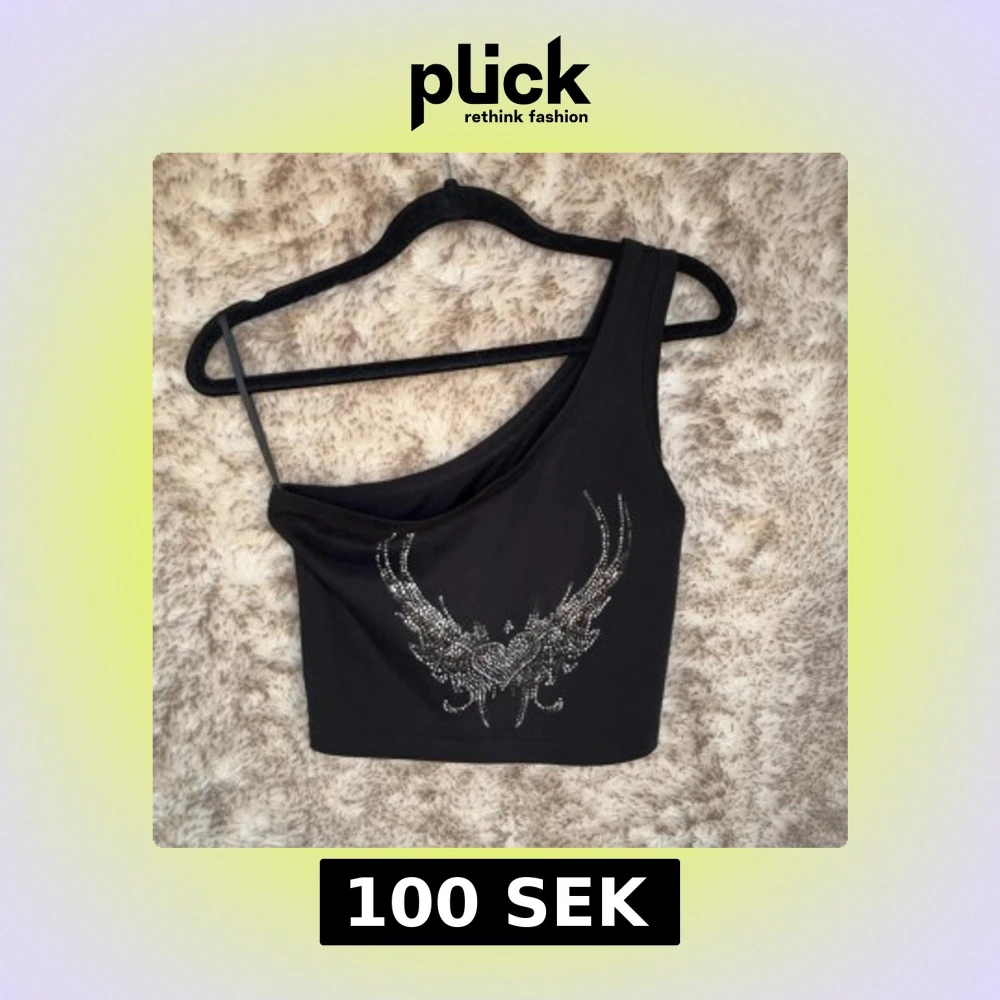 Svart croppad one shoulder topp med glittrande strassdetaljer i form av vingar och hjärta framtill.