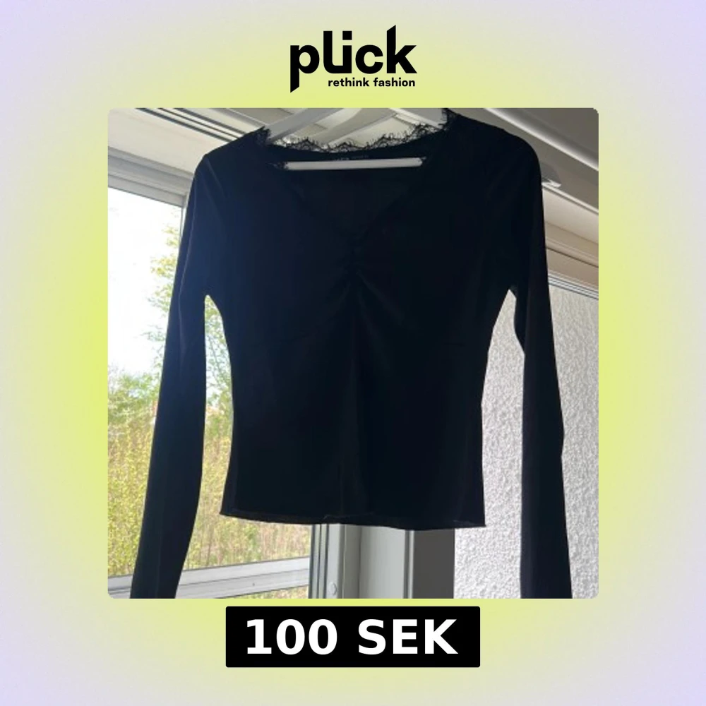 Svart långärmad topp med spetsdetaljer - Snygg svart långärmad topp med v-ringning och spetsdetaljer vid hals och nederkant. Perfekt för en stilren look. Det är storlek M men passar en S och M skulle jag säga då den är stretchig. Använd fåtal gånger! Inga defekter