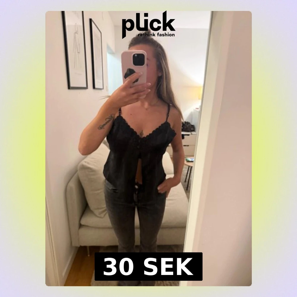 Säljer en svart linnetopp med tunna justerbara axelband och vacker spets längs v-ringningen. Toppen har knappar framtill och är lätt croppad, vilket ger en cool och avslappnad vibe. Perfekt att styla med jeans eller kjol för en trendig look.