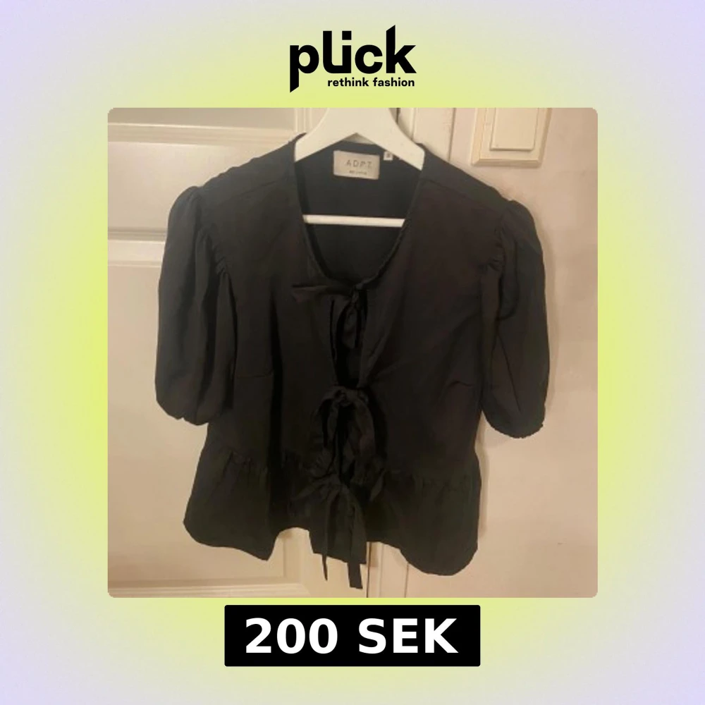 Svart blus från ADPT med tre dekorativa knyt framtill och puffiga korta ärmar. Blusen har en lätt v-ringning och volang nedtill, vilket ger en trendig och söt look. Perfekt för dig som gillar detaljer och en feminin stil.