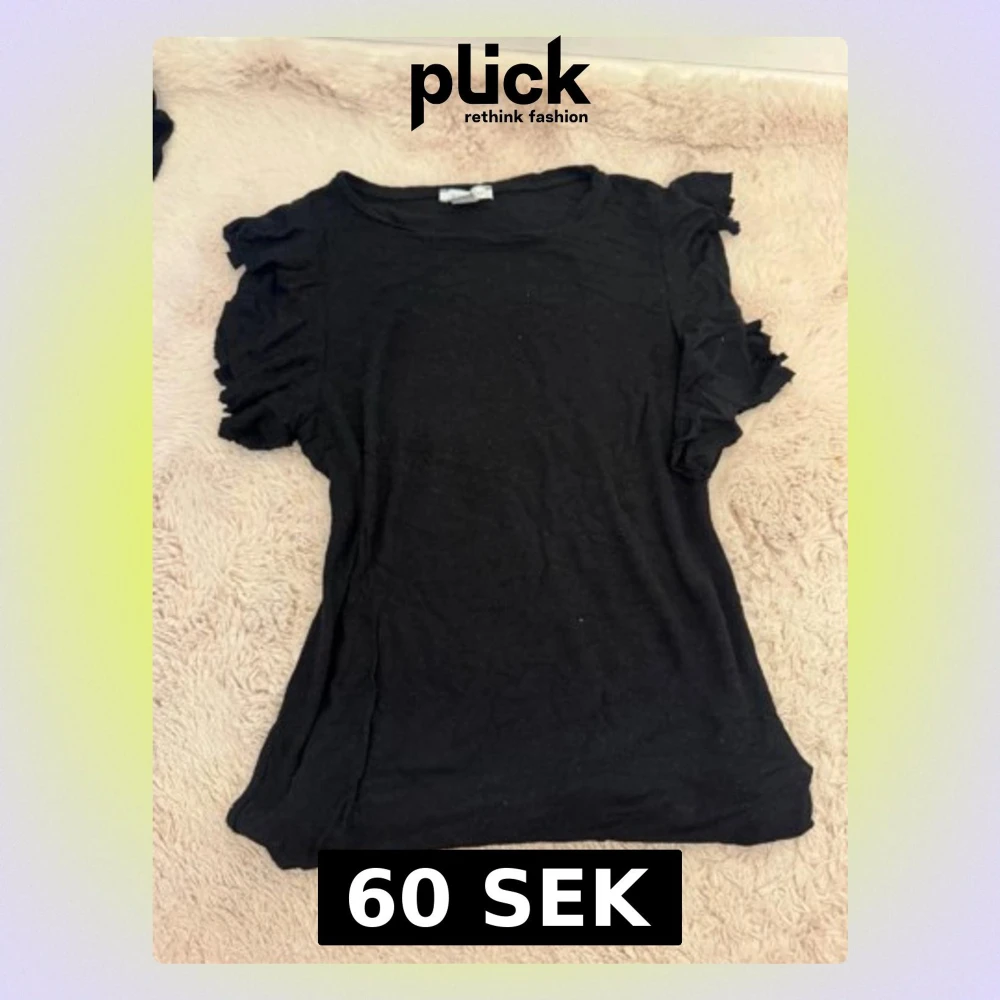 Svart topp med rund halsringning och korta ärmar med volangdetaljer. Enkel och stilren design som passar till många olika outfits. Mjuk och lätt i materialet, perfekt för en avslappnad look.