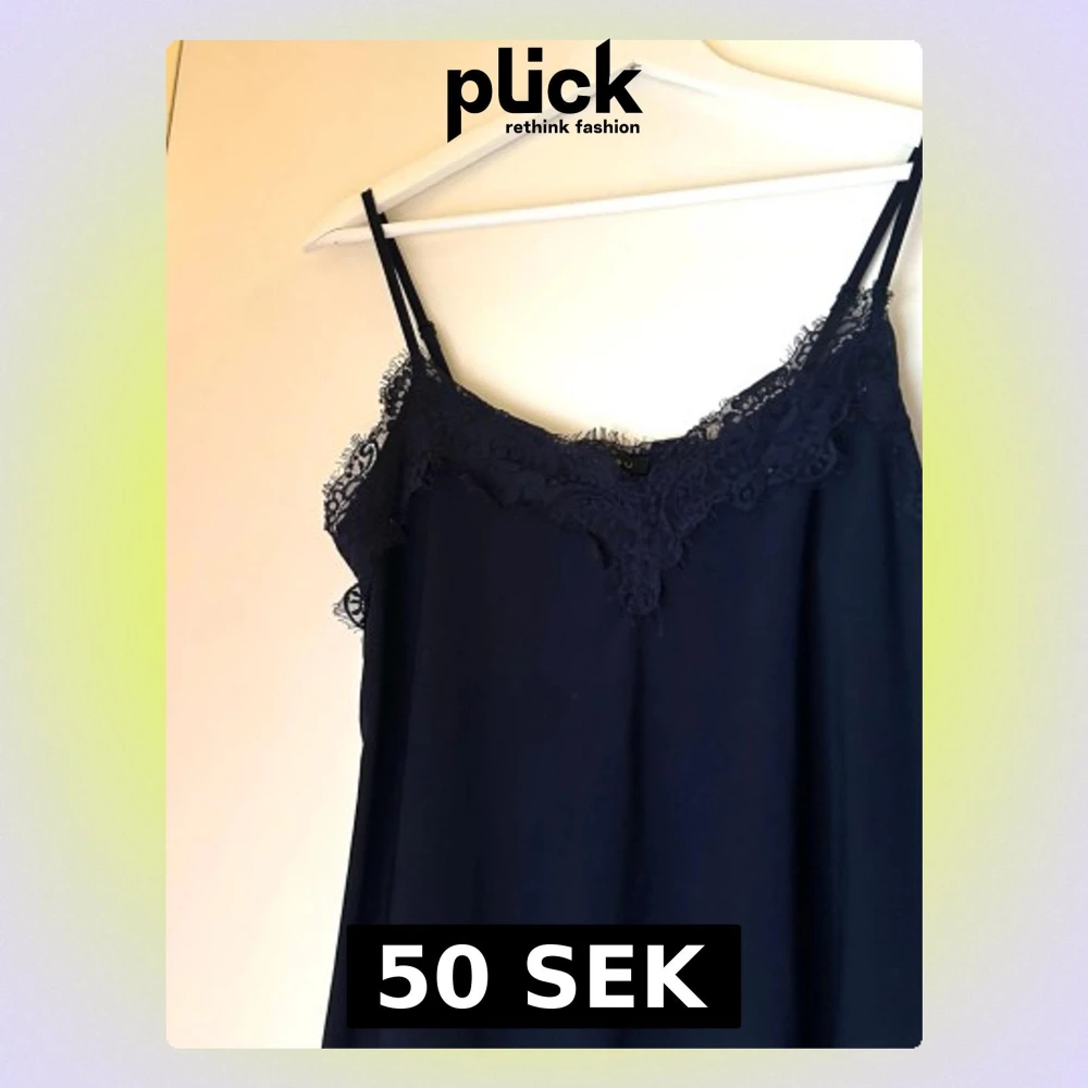 Vackert marinblått linne med spets vid ringningen ovanför bysten. En feminin och tidlös topp som funkar lika bra till vardags som till mer uppklädda tillfällen.