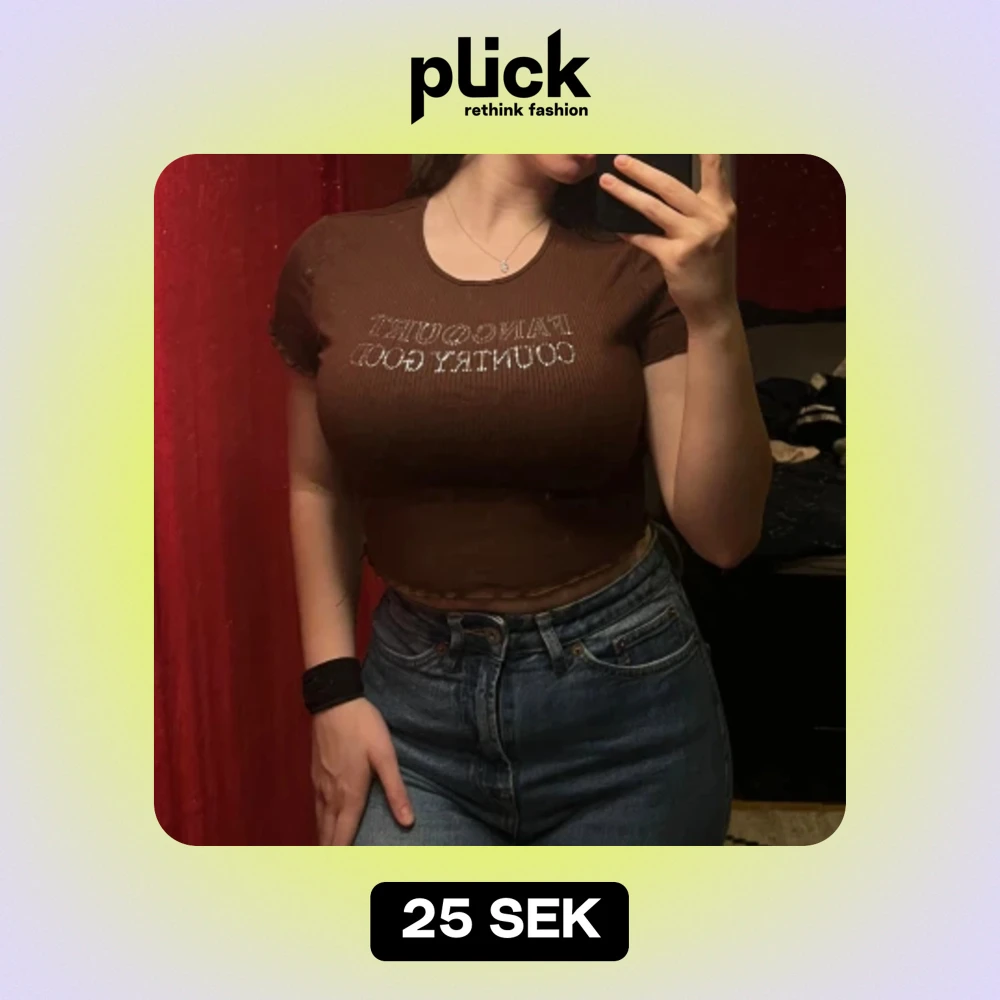 Säljer en brun ribbad t-shirt med texten 'FANCYOUTFIT COUNTRY GOOD' i glittriga bokstäver. Den är kortärmad och har en tight passform, perfekt för en avslappnad stil.