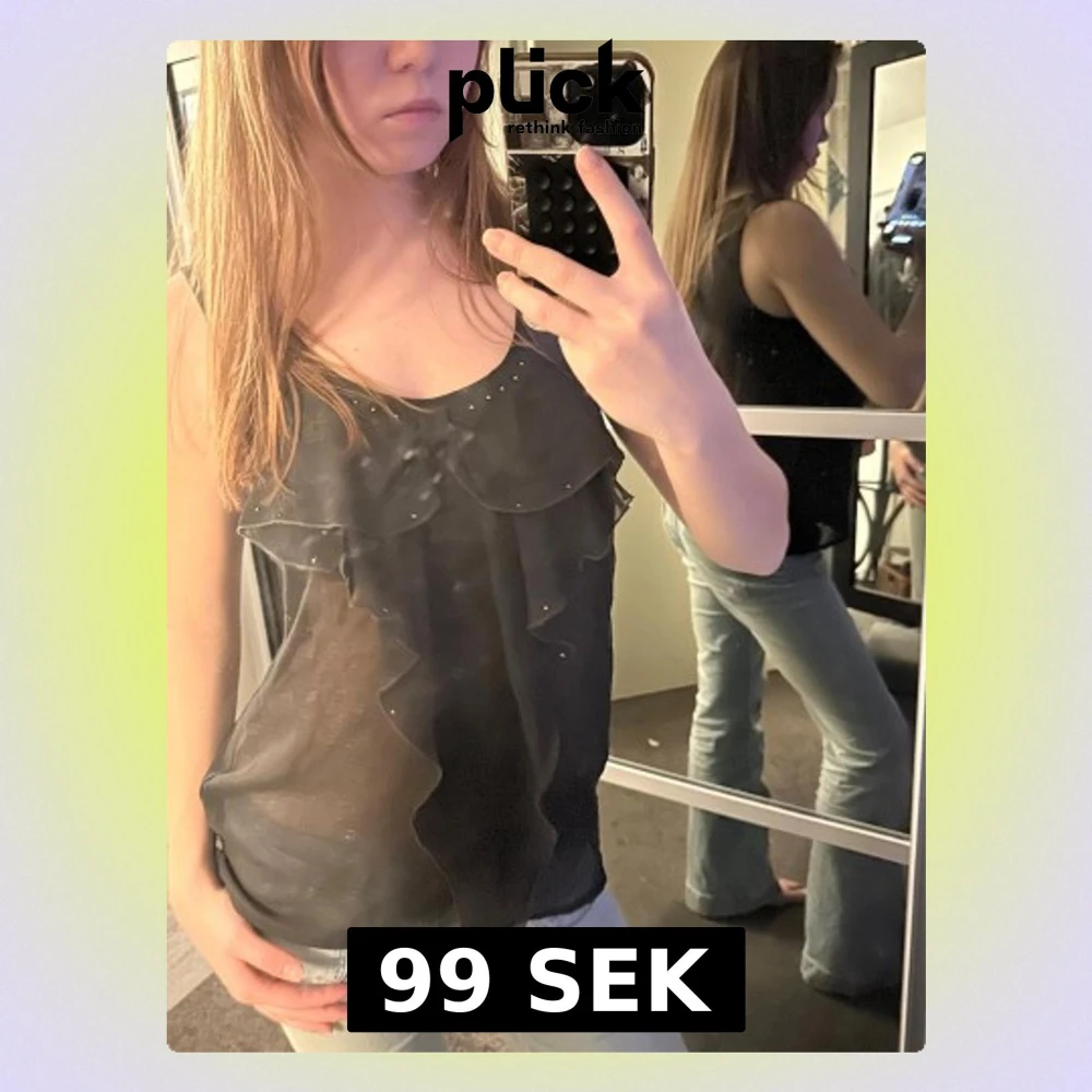 Säljer en svart, ärmlös linnetopp med volangdetaljer. Snygggg