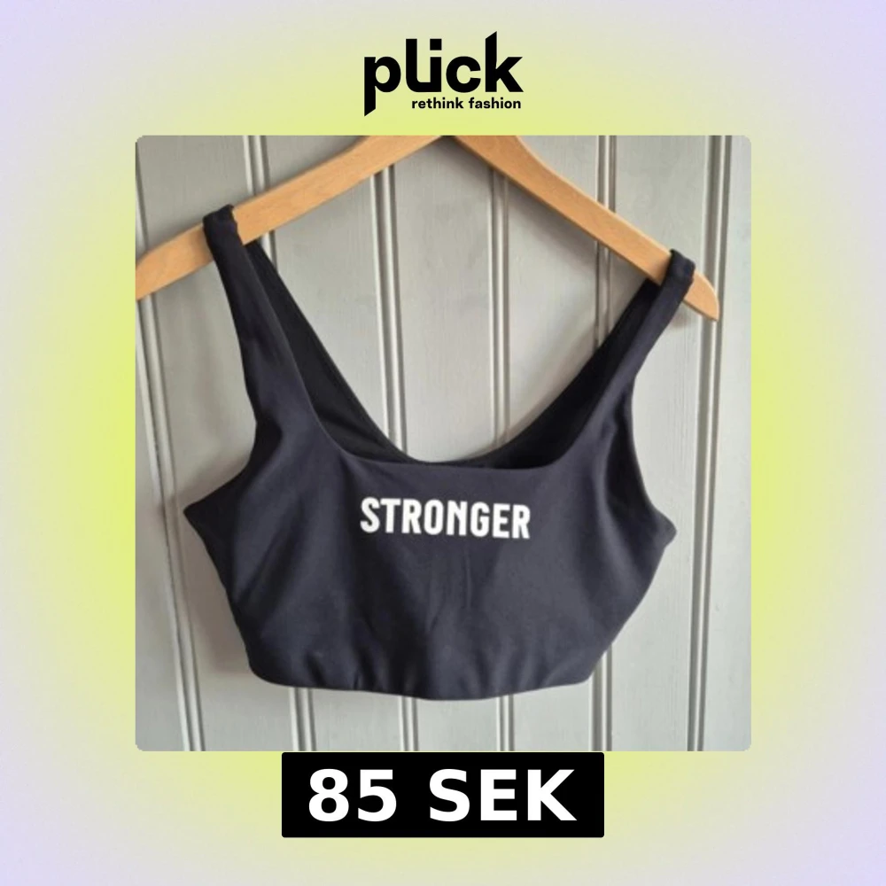 Svart sport-bh storlek M från Stronger med breda axelband och vit logotyp framtill. Perfekt för träning och ger bra stöd. Enkel och stilren design som passar till det mesta i träningsgarderoben.