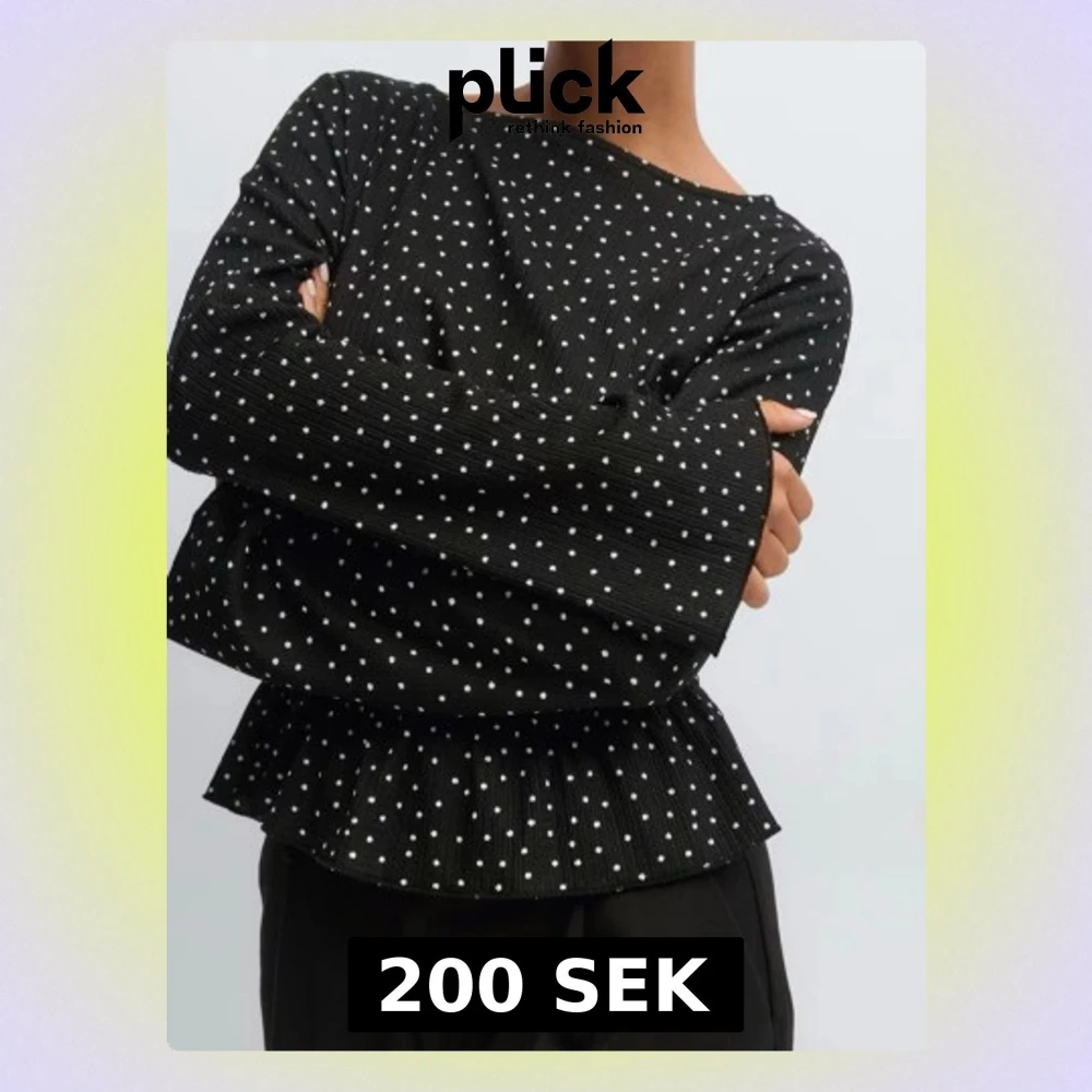Svart blus med vita prickar och lång ärm. Toppen har en smockad midja och en liten volangkant. Använd en gång, inga defekter.