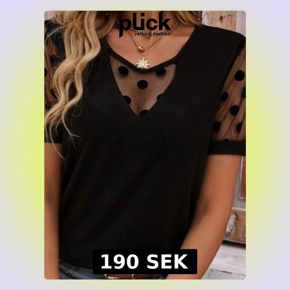 Trendig svart topp med transparent mesh och stora svarta prickar på ärmar och vid halsringningen. V-ringad design och korta ärmar ger en modern look. Perfekt för dig som vill sticka ut lite extra.