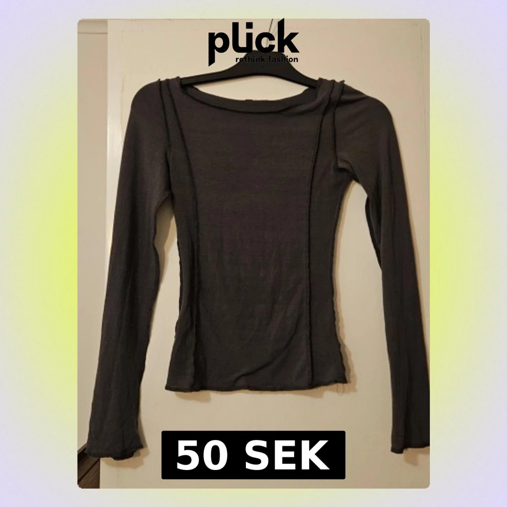 Säljer en mörkgrå långärmad topp med figurnära passform. Toppen är tillverkad i ett tunt, stretchigt material och har synliga sömmar som ger en trendig look.