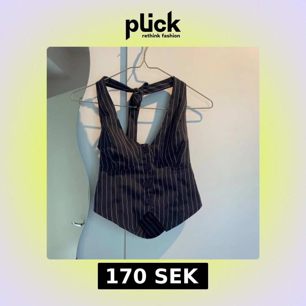 Supersnygg väst som tyvärr är förstor för mig! Den går att knyta i nacken. Västen har djup v-ringning, knappar framtill och en figurnära passform. Storleken står inte men skulle chansa på något större än S som jag oftast har.