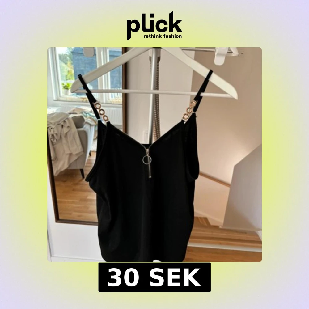 Snygg svart linne med kedjedetaljer på axelbanden och en dragkedja framtill. Perfekt för en stilren look.