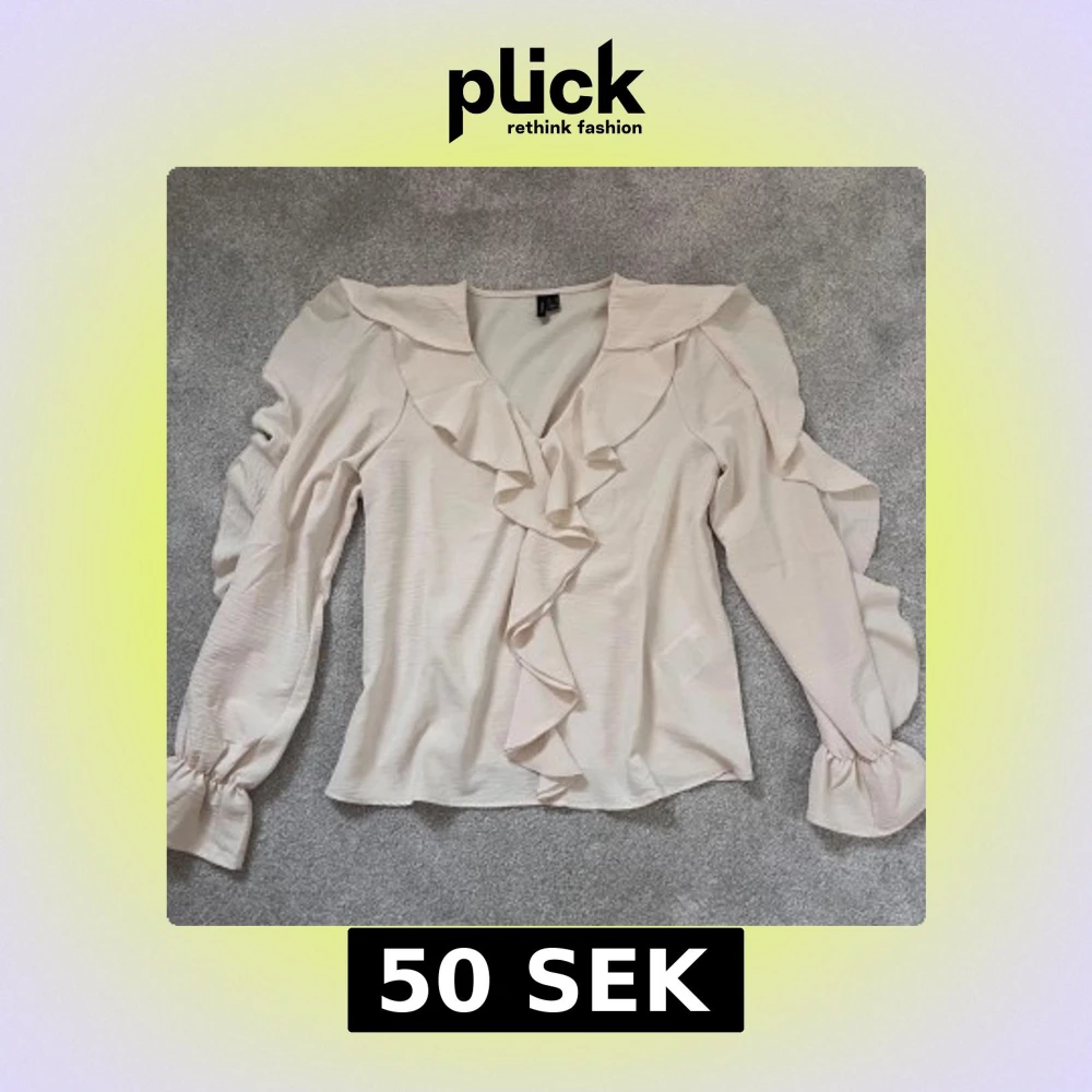 Supersöt beige blus från Vero Moda i storlek XS. Blusen har långa ärmar med volangdetaljer och v-ringning framtill med volanger längs halsringningen. Tillverkad i ett lätt och flowy material.