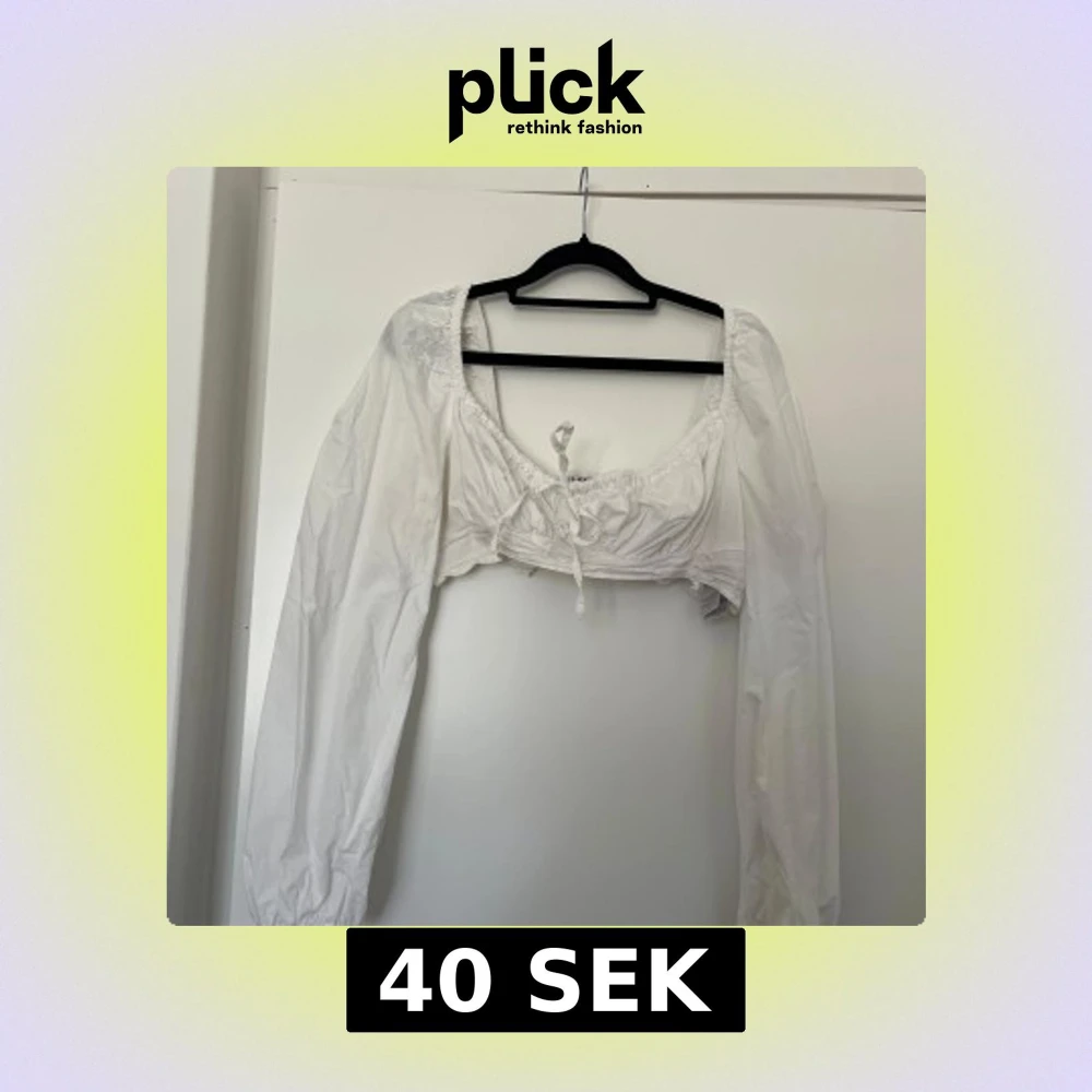 Superfin vit croppad blus med långa puffärmar och söt knytning framtill. Viss missfärgning under armar efter deo men inget som syns vid användning, se bild.