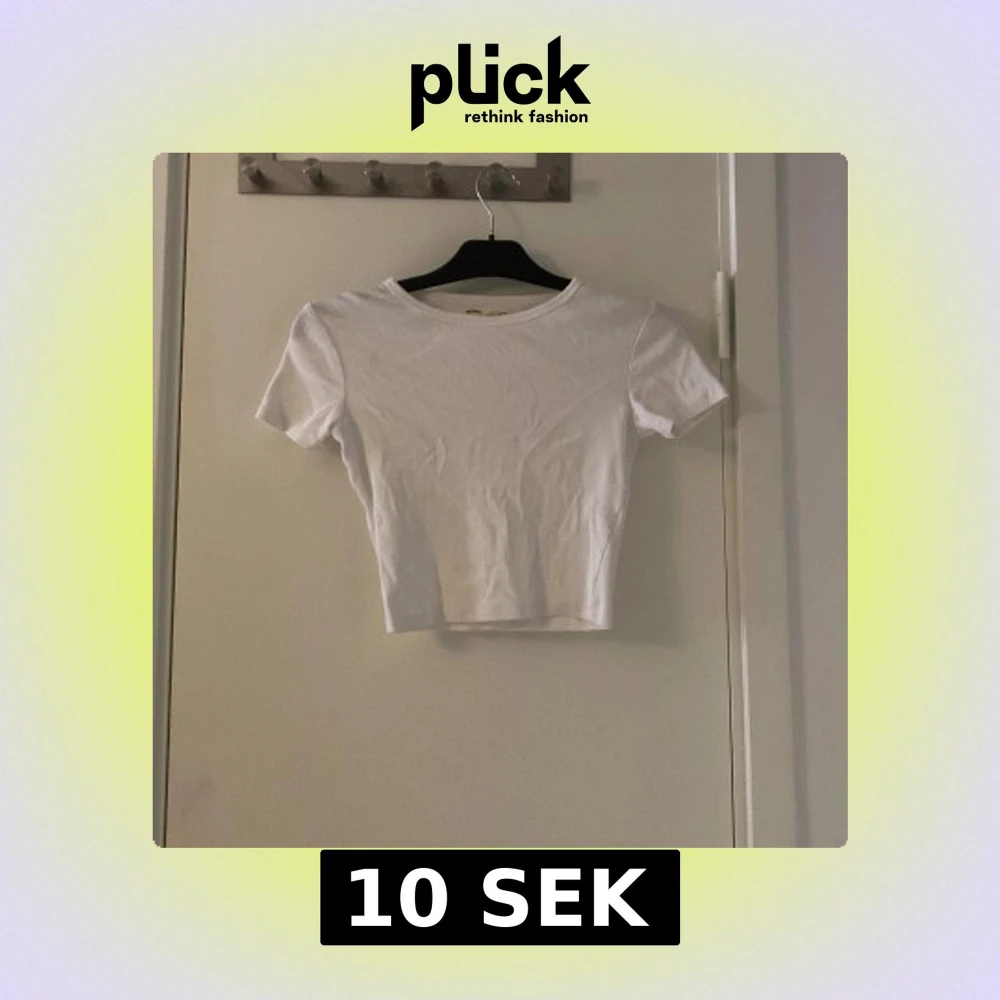 En enkel och fräsch vit croppad topp med korta ärmar och rund halsringning. Toppen är ribbad och sitter snyggt figurnära, perfekt att matcha med jeans eller kjol för en clean look.