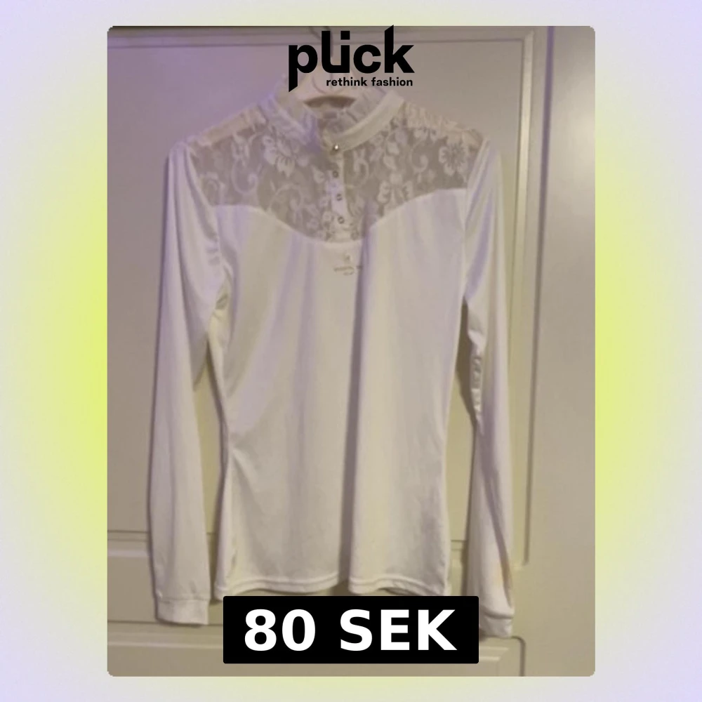 Vit spetsblus med lång ärm - Säljer en vit blus i spets med långärmade ärmar och fyrkantig ringning. Blusen är figurnära och har ett vackert spetsmönster över hela plagget, inklusive ärmarna. Perfekt för dig som gillar romantisk och feminin stil.