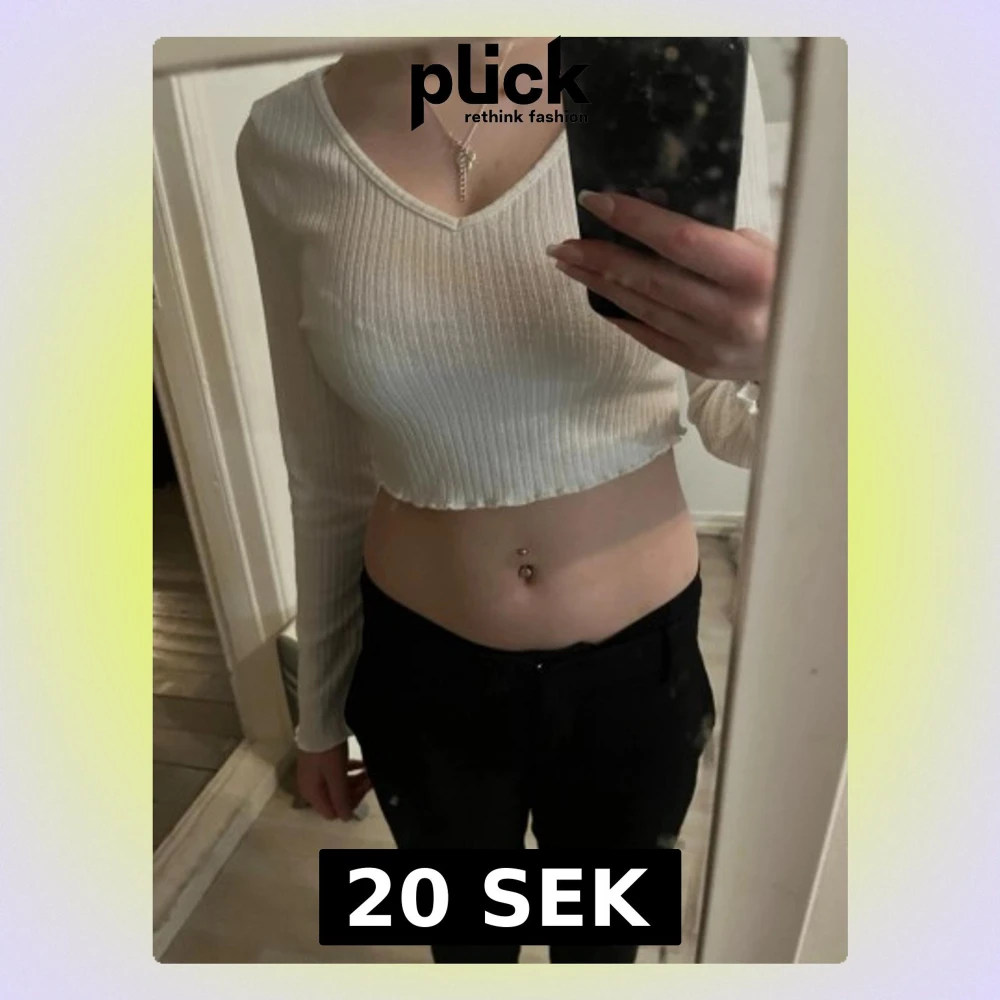 Fin vit topp - Säljer en vit ribbad topp med lång ärm och djup v-ringning. Toppen har en figurnära passform och är tillverkad i ett stretchigt material som sitter snyggt på kroppen. Perfekt att styla med jeans eller kjol för en trendig look.