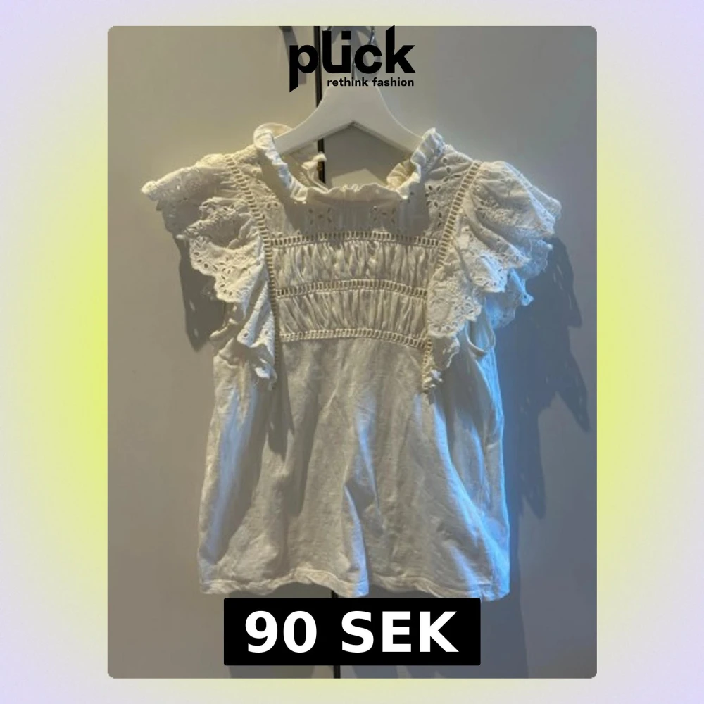 Söt vit blus från Holly & Whyte by Lindex med volangärmar och detaljerad spets upptill. Blusen har rundad hals och broderade hålmönster. Perfekt för dig som gillar romantisk och feminin stil.