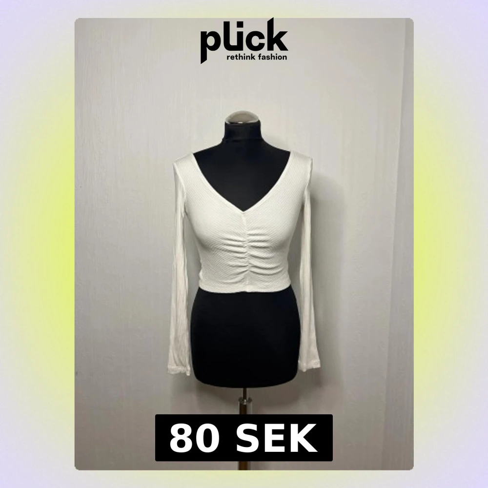 Säljer en vit croppad topp i ribbad bomull med lång ärm och snygg v-ringning. Toppen har rynkade detaljer framtill som ger en cool look. Perfekt för dig som gillar stilrena och trendiga plagg med lite edge. V ringad även bak på ryggen.