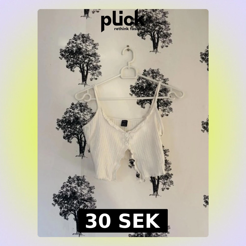 Säljer en vit croppad linnetopp från Shein i storlek XS. Toppen har smala axelband, ribbad struktur och knappar framtill. Den har en vågig, rå kant nertill som ger en trendig look. Perfekt till höga jeans eller kjol.