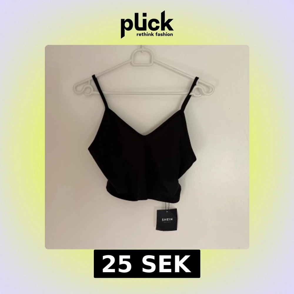 En svart croppad linnetopp från SHEIN med smala axelband och v-ringad hals. Toppen är enkel och stilren, perfekt att matcha med jeans eller kjol. Tillverkad i mjuk polyesterblandning med lite stretch för en bekväm passform.