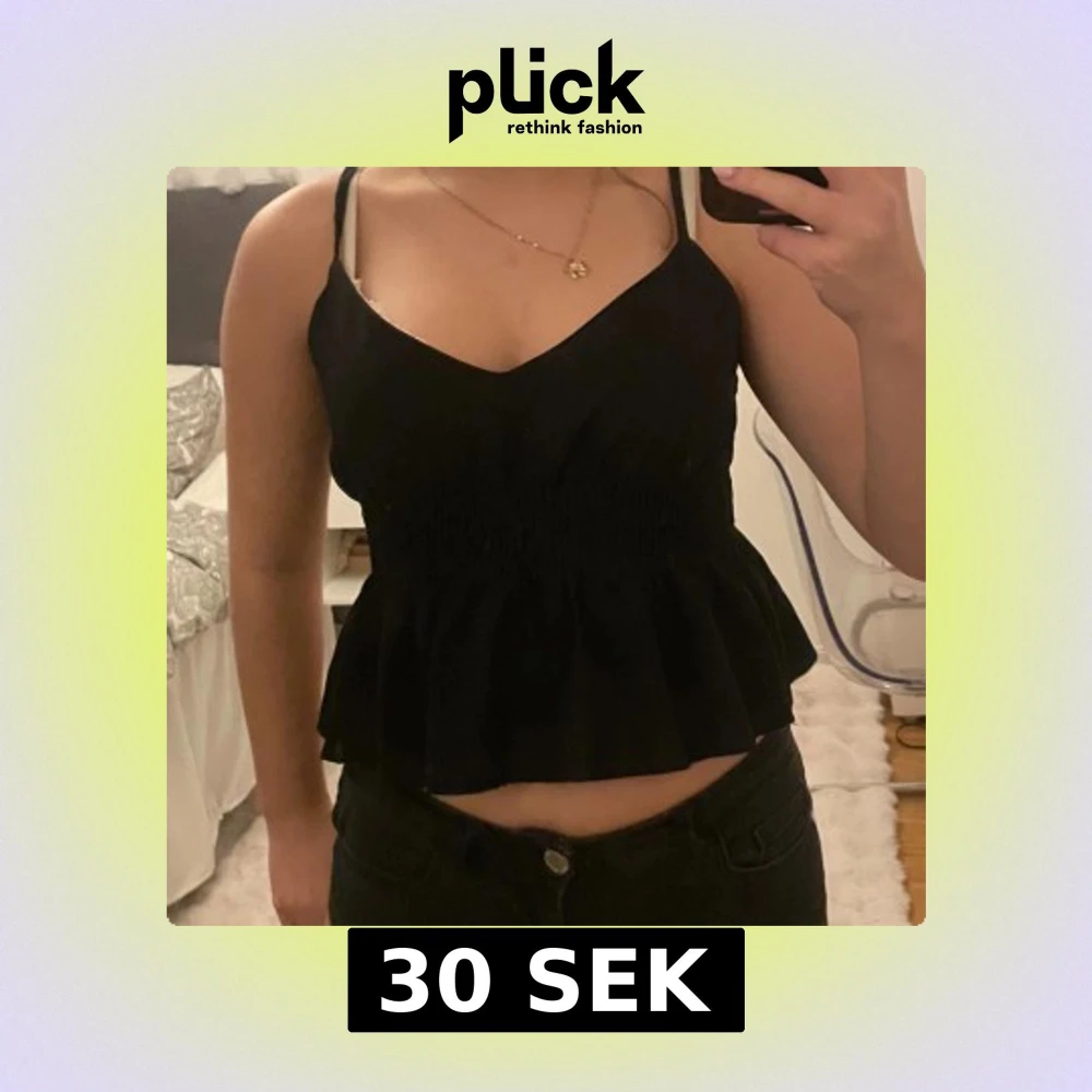 Säljer en svart croppad linnetopp med smala axelband och v-ringad hals. Toppen har en smockad midja som ger en snygg passform och en volang nedtill.