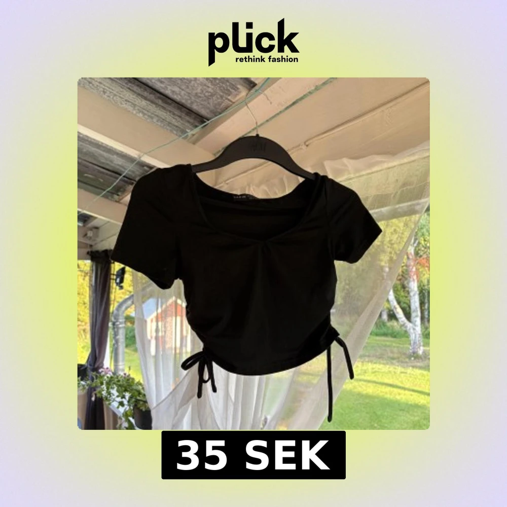 Svart croppad topp från Shein i storlek XS. T-shirten har korta ärmar, v-ringning och snygga knytband i sidorna som ger en cool detalj. Perfekt till jeans eller kjol för en trendig look.