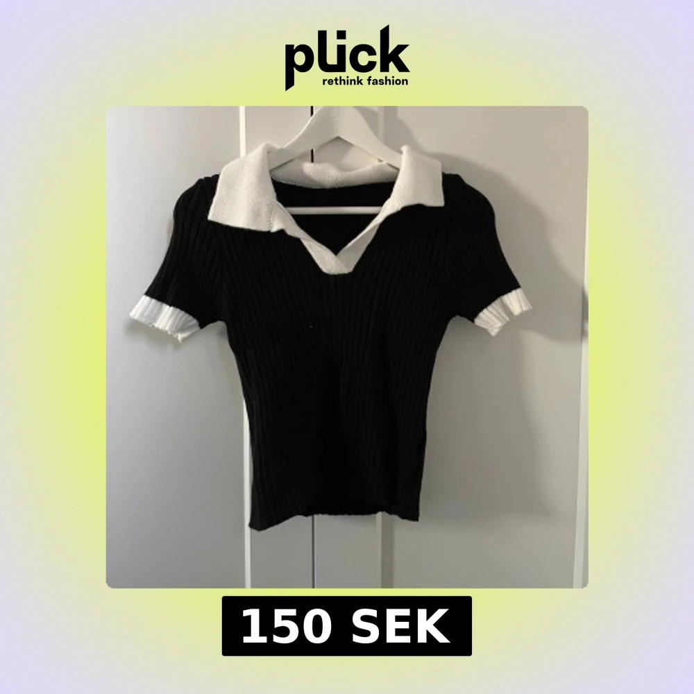 Snygg svart ribbad topp med vit krage och vita detaljer vid ärmsluten. Toppen har v-ringning och korta ärmar.