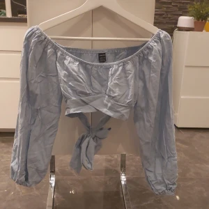 Blå omlottopp med lång ärm från Stradivarius  - Snygg blå topp från Stradivarius i mjuk bomull. Modellen är croppad med omlottdetalj framtill och har långa ärmar. Perfekt för dig som gillar enkel stil med en twist. Rund halsringning och slät yta utan mönster. Kanske är lite skrynklig på bilden men stryker isf innan jag postar!