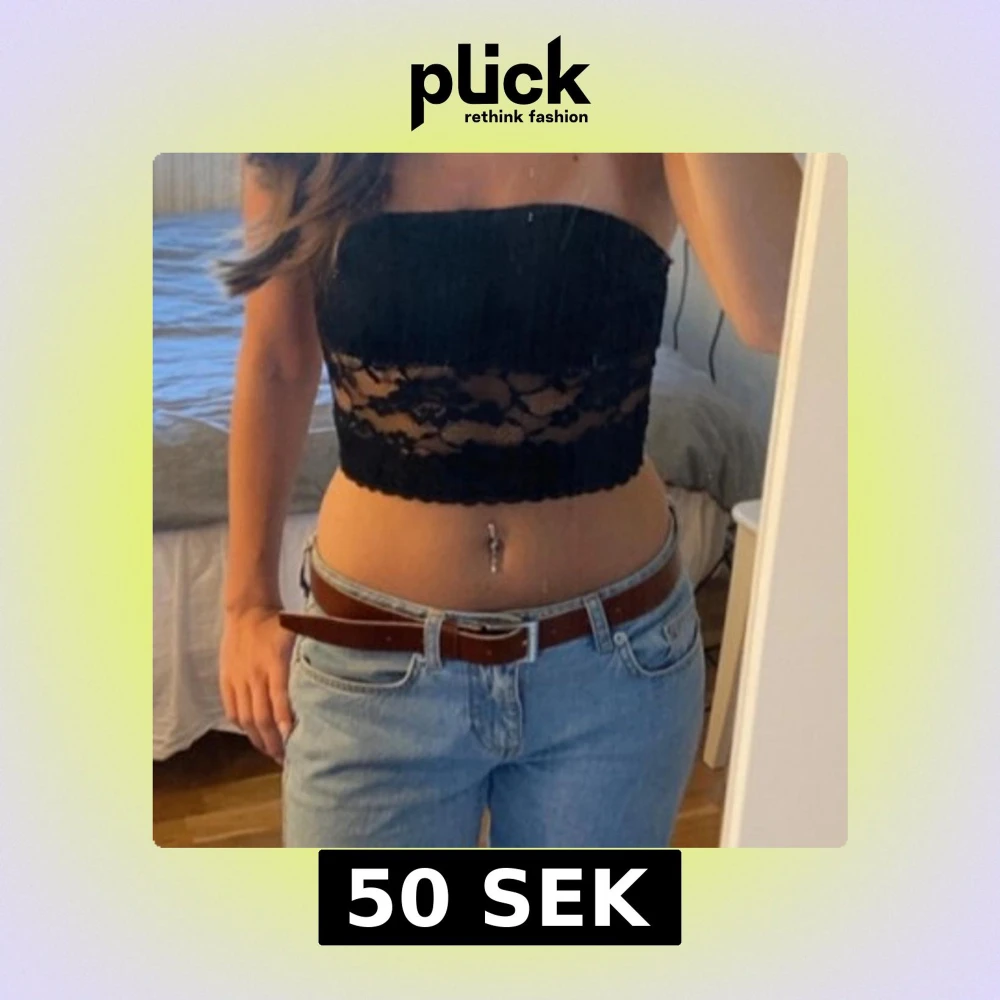Säljer en svart bandeau tubtopp med snygga spetsdetaljer. Toppen är croppad och sitter tight runt kroppen, perfekt för att skapa en cool och trendig look. Spetsen ger en extra touch och gör toppen unik.
