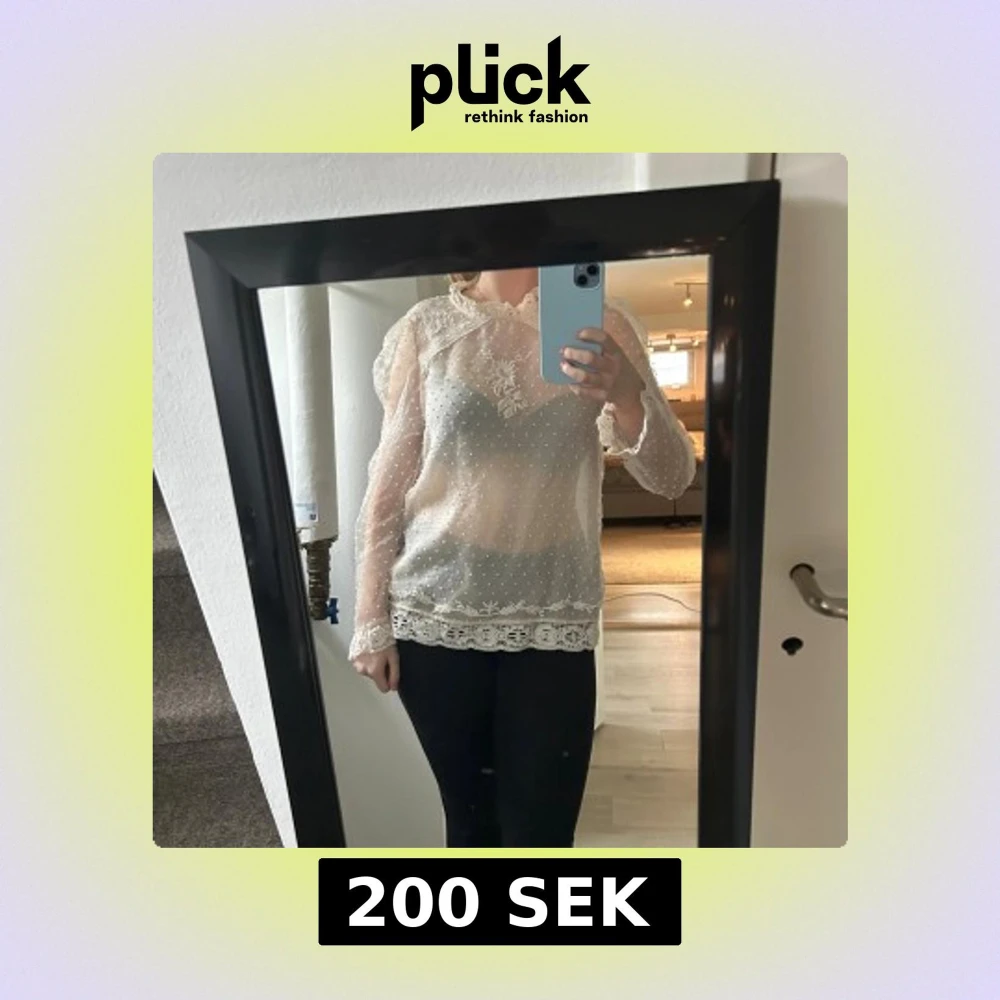 Romantisk vit blus i transparent spets med små prickar, broderade detaljer vid hals och nederkant samt långärmad modell. Blusen har volangkant nertill och en feminin, luftig känsla. Perfekt för dig som gillar en söt och trendig stil.🩷