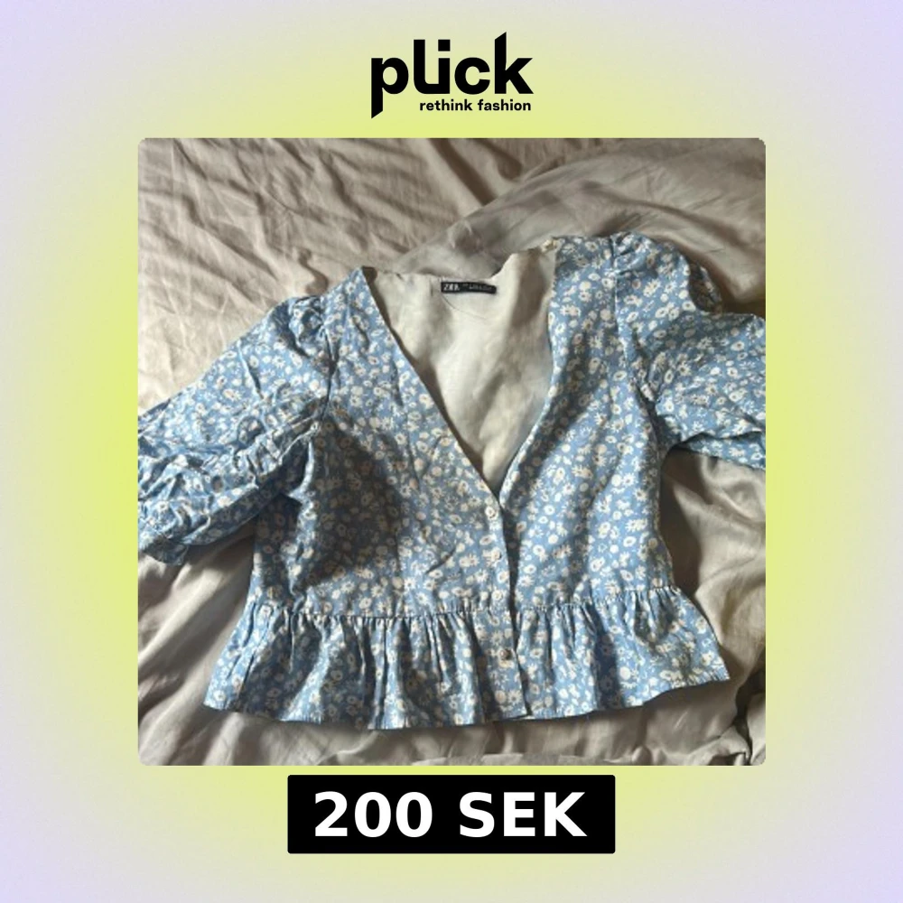 Supersöt blommig blus från Zara i ljusblått med vita små blommor. Modellen har v-ringning, knappar framtill, volangkant nertill och puffiga trekvartsärmar med resår. Perfekt för vår och sommar när du vill ha en romantisk vibe.