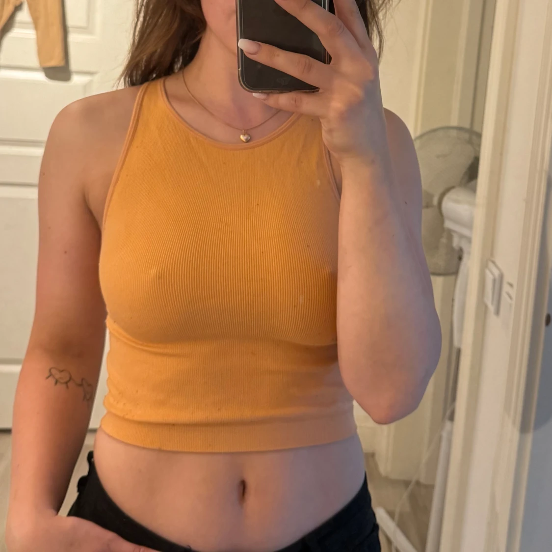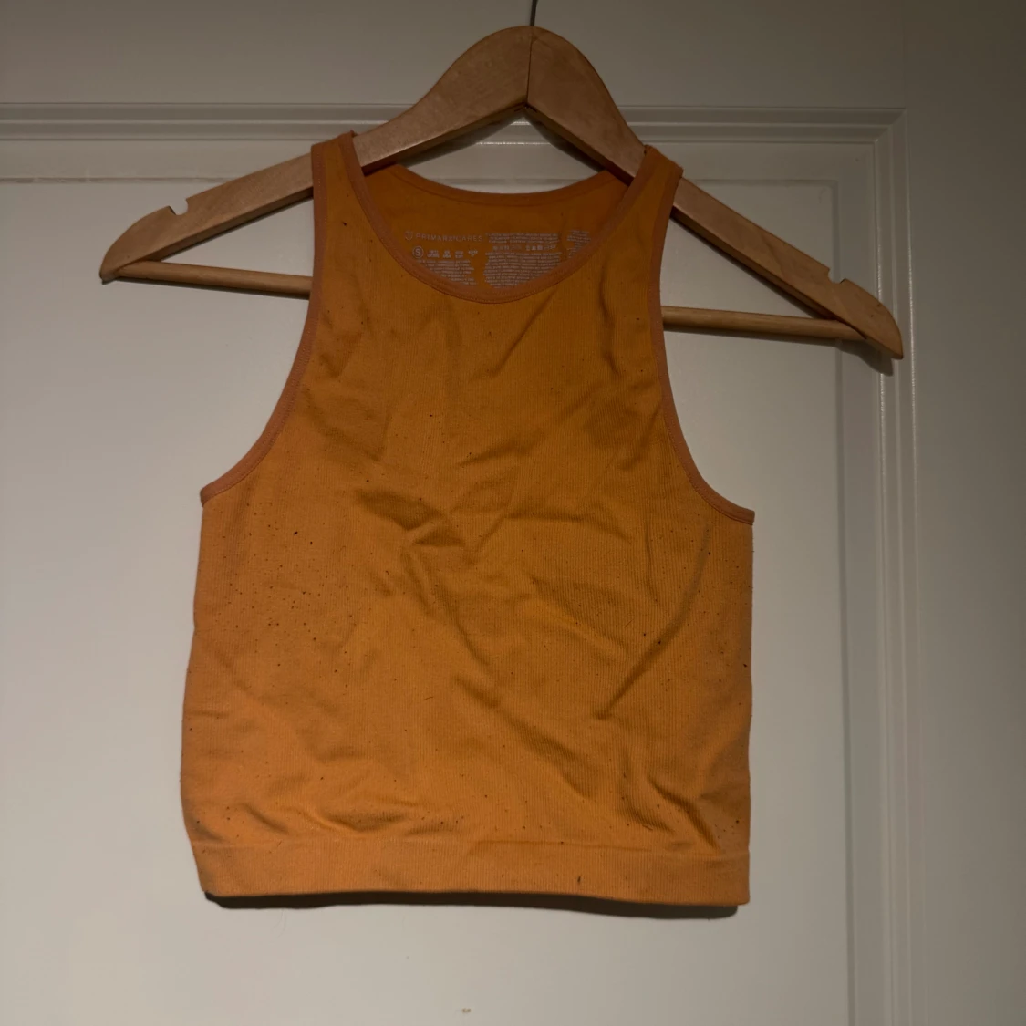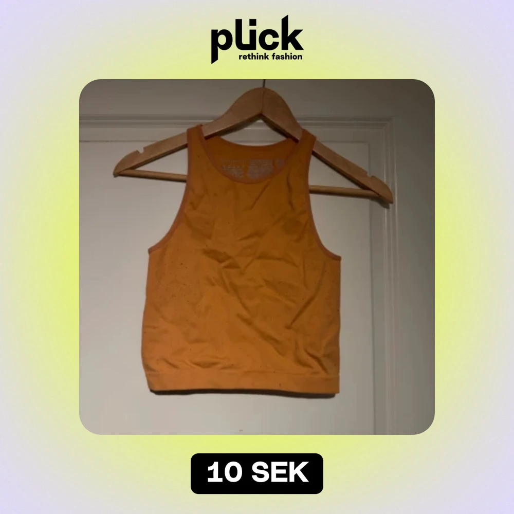 Aprikosfärgat träningstopp, använd och lite nopprig efter tvättad men annars fint skick. Mer aprikosfärgad än orange som bilder visar