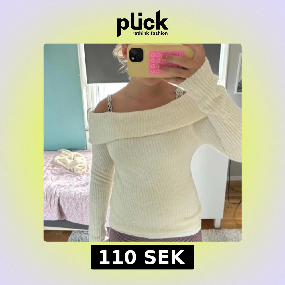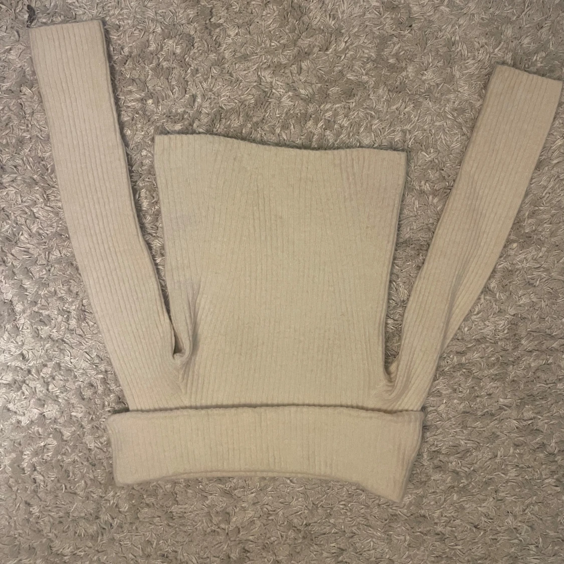 Säljer en stilren beige ribbad offshoulder topp. Perfekt för en trendig look med sin unika design och mjuka material. Passar utmärkt till både jeans och kjol. Ett måste i garderoben för den modeintresserade! (Bilden blev upp och ner, men det gör inget med tröjan att göra)
